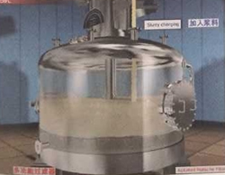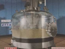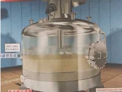 圖①:反應(yīng)釜中的混懸液靠自身的重力或經(jīng)泵注入到過濾器中,然后在濾液接收裝置中抽真空,濾液接收裝置連接在濾液流出口上。 圖②:濾液通過濾床被抽濾至接收裝置,濾餅逐漸在濾床上形成。 圖③:當(dāng)大多數(shù)濾液抽出后,濾床上沉積的濾餅可能還含有5%-20%的溶劑,具體情況與混懸液中固體的性質(zhì)有關(guān)。 圖④:首次過濾完成后,如果需要,可噴淋洗滌液,啟動攪拌器反向攪拌,使濾餅重新混懸。 圖⑤:通過操作攪拌器,還可以輕輕地擠壓濾餅,擠出殘余液體。 圖⑥:為了盡可能多地脫除濾餅中的殘留液體或溶劑,過濾器可加上夾套,在其中通蒸汽或熱水加熱干燥。在過濾器的頂部和底部同時抽真空,殘留溶劑揮發(fā),通過接收裝置上的冷凝器濃縮并回收。對有些物料,執(zhí)行上述流程即可,毋須另配干燥器進(jìn)行干燥。 圖⑦:最后,經(jīng)過攪拌器在卸料方向的旋轉(zhuǎn)和同時的下降運(yùn)動,攪拌器刮鏟一層一層地順序?qū)V餅刮出,濾餅可從卸料口自動出料。 圖⑧:攪拌器的攪拌漿和刮鏟示意。 紐克多功能過濾器系統(tǒng)具備如下優(yōu)點: 1、系統(tǒng)封閉:此設(shè)備是一個全封閉運(yùn)行的系統(tǒng),能完全避免生產(chǎn)過程中溶劑對空氣的污染,同時能減少因與毒性物接觸而導(dǎo)致操作人員中毒事故的發(fā)生。 2、回收完全:物料和溶劑近乎完全回收,避免因物料遺漏和溶劑揮發(fā)而引起的浪費(fèi),具有很大的經(jīng)濟(jì)效益,特別是處理物料和使用溶劑價值較高時更是如此。 3、同時干燥:過濾、清洗和干燥能在同一設(shè)備中完成。容器壁可以配備加熱套層,從而能夠進(jìn)行干燥的操作。 4、操作連續(xù):能夠使過濾和干燥在一個連續(xù)的系統(tǒng)內(nèi)進(jìn)行,毋須處理濕濾餅。在過濾器下可以連接一個干燥器,使?jié)駷V餅直接卸入干燥器,干燥后的產(chǎn)品可以機(jī)械傳送至稱量、包裝等工段。 5、節(jié)約人力:一個經(jīng)過簡單培訓(xùn)的非技術(shù)人員即可以完成操作。開、關(guān)、自動進(jìn)料、自動出料都毋須技術(shù)人員監(jiān)控。 6、清洗徹底:由于此設(shè)備具有自動噴淋和重新打漿的功能,濾餅可以得到非常徹底的清洗。并且洗滌液用量較其它類型設(shè)備少,可減少排污量和降低廢水處理費(fèi)用。 7、清洗生產(chǎn):此多功能過濾器干燥系統(tǒng)裝配有粉塵捕集器,能完全收集干燥后產(chǎn)生的粉塵,可滿足高潔凈度的生產(chǎn)操作要求。 | |